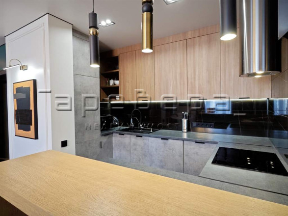 Чтобы создать атмосферу уюта и тепла, любимую кухню сделали очень функциональной и современной, фирмы Egger, здесь не только фасады из шпона, но и объемная барная стойка выполнена из дерева. Кухонный гарнитур оснащен всей встроенной техникой для удобства хозяйки.