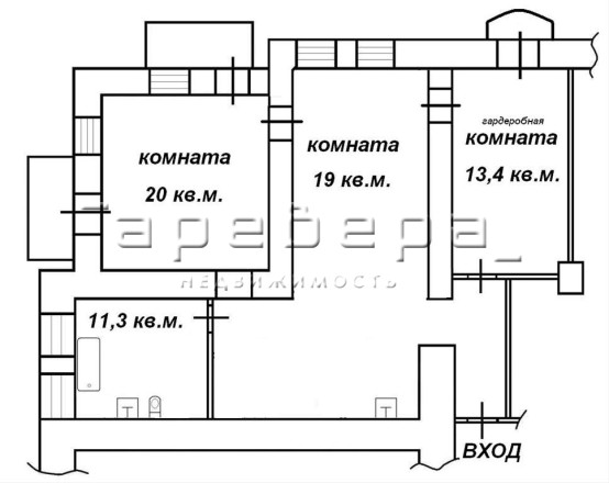 Кухня-гостиная занимает центральное место в квартире, по обе стороны комнаты — спальня и гардеробная. Большой совмещенный санузел с двумя арочными окнами.