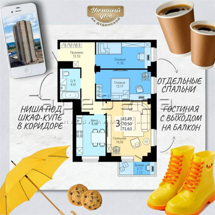 Удобные планировки. Особенный акцент на малых двухкомнатных (49 и 48 кв. м). По стоимости они сравнимы с однокомнатными на престижной Взлетке. Но имеют ряд преимуществ: отдельная небольшая комната, предназначенная по желанию хозяев под личный кабинет, гардеробную, или небольшую детскую.