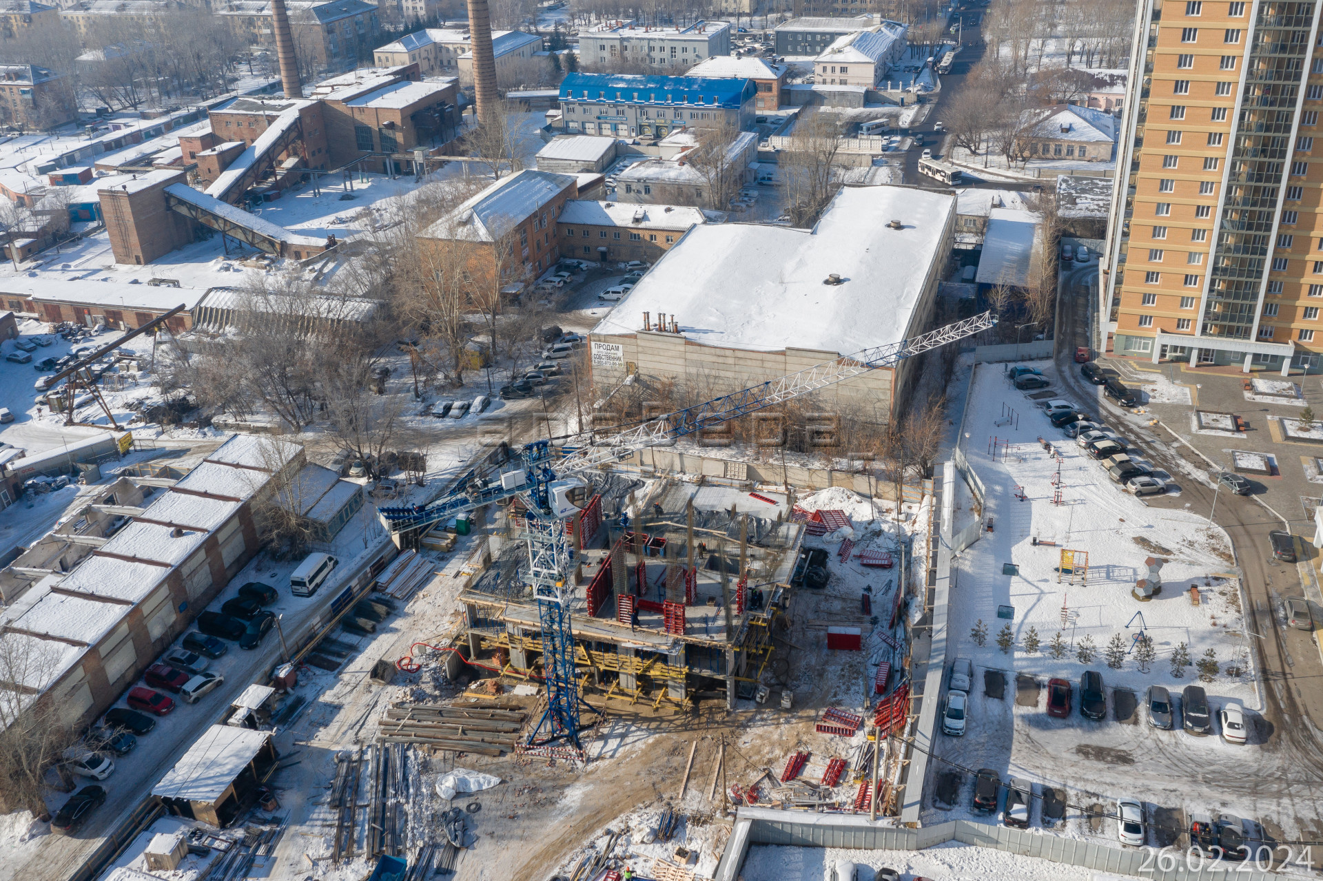 В центре квартала будет расположена многоуровневая парковка со встроенным нежилым помещением под супермаркет. На крыше здания разместится большая детская площадка, хорошо просматриваемая из окон домов.