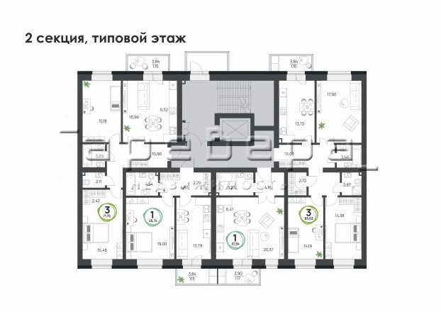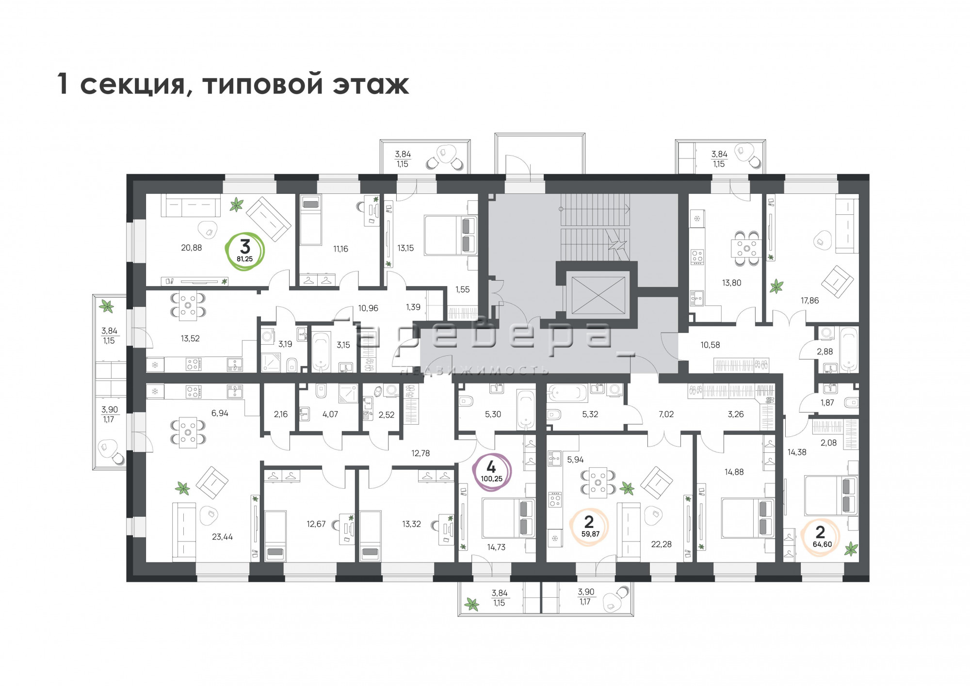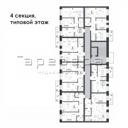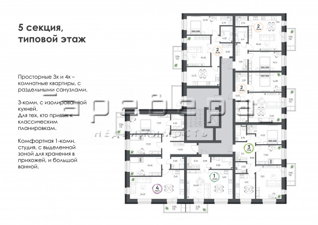 Предусмотрены 1-4-комнатные квартиры площадью от 37 до 102 м². Также на первом этаже доступны к покупке коммерческие помещения площадью от 30 до 110 м².