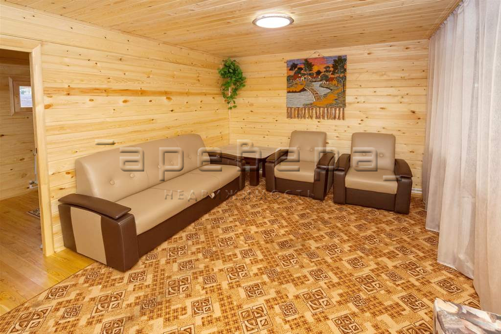 На базе отдыха есть большая кедровая баня, которая топится исключительно березовыми дровами! Общая площадь Бани 156 м2. В бане может комфортно разместиться компания 20 человек. На 1-ом этаже находится большая комната отдыха с телевизором и мягкой мебелью, парная (3х4м), душевая кабина, бассейн ( 3х2.5м ), санузел, кухонный уголок, холодильник, микроволновая печь, чайник, посуда. На 2-ом этаже большой холл с мягкой мебелью, бильярд, 2-е спальни в каждой двуспальная кровать.