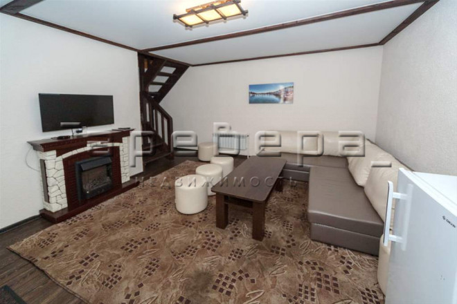 В доме на 1-ом этаже находится гостиная с камином, мягкий уголок, телевизор, кухня, холодильник, есть микроволновая печь, чайник, посуда. Санузел с душевой.