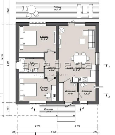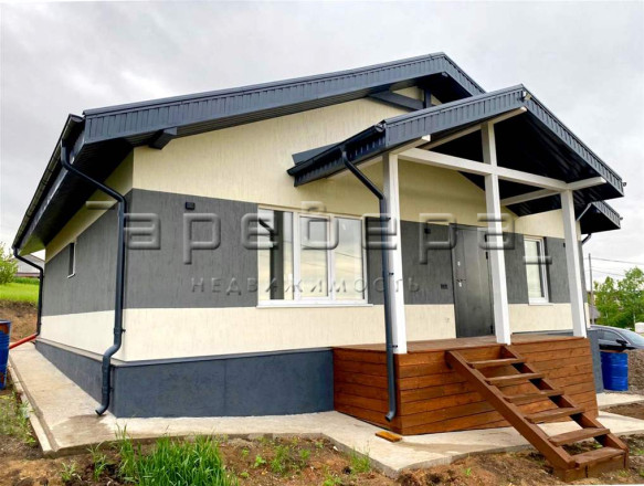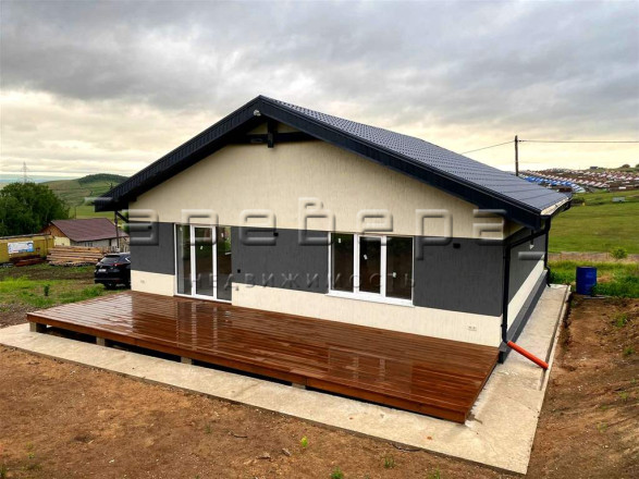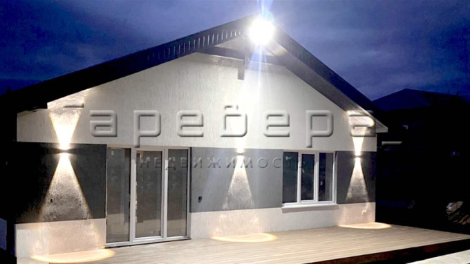 Дом из газоблоков, одноэтажный, общая площадь — 121 кв.м. В доме 2 спальни 14.5 и 16.6 кв.м. и большая кухня гостиная — 32.1 кв.м. К дому пристроена терраса -30 кв.м.