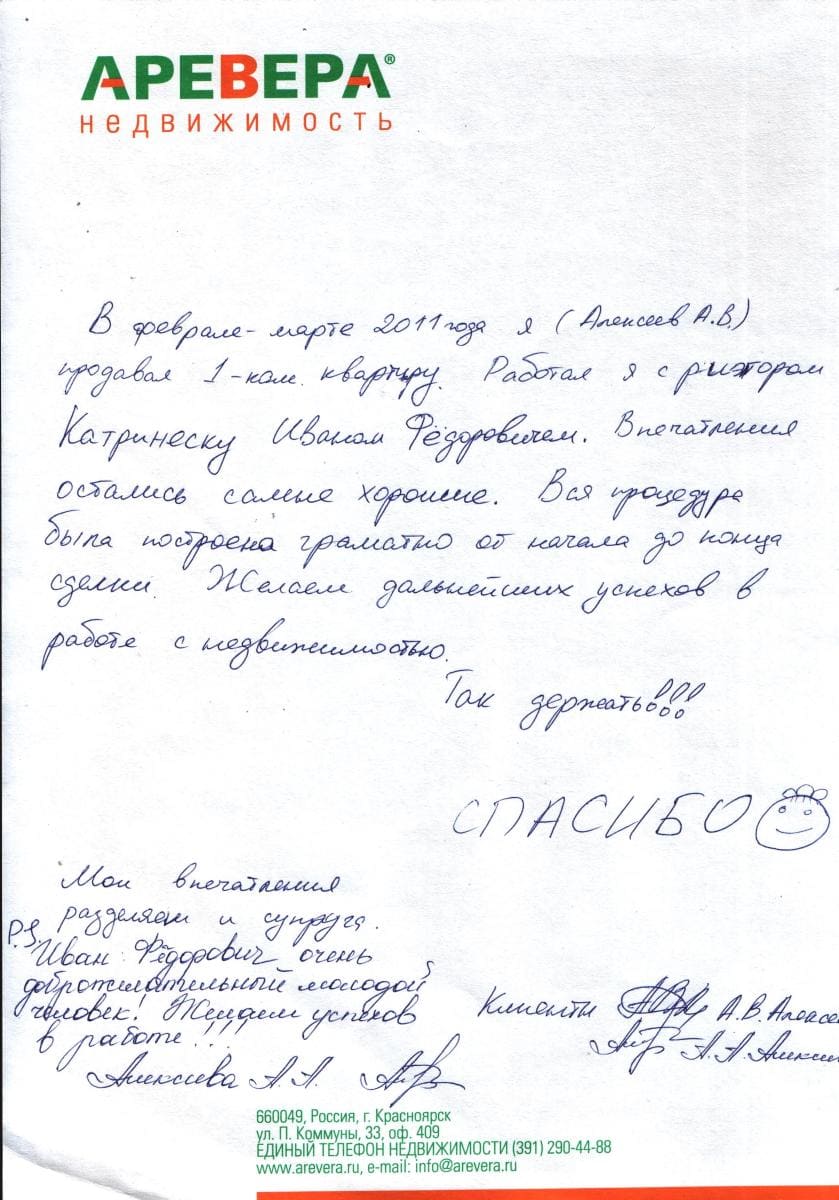 Вернёмся к нашему клиенту. Найти для покупки квартиру нужного качества и цены оказалось нелёгкой задачей. Спасла ситуацию находчивость риэлтора Ивана Катринеску. Подобрав квартиру, которая, кроме цены, подходила семье по всем параметрам (риэлтором продавца была Александра Орлова), он настоял на том, чтобы клиенты посмотрели её, и в случае если квартира устроит, написали оферту — предложение о покупке за цену, которую сами считают адекватной. Квартира с хорошим ремонтом понравилась, но вот с ценой работали долго, выдвигая поочередно предложения несколько раз. Однако в итоге соглашение было достигнуто: определённая стоимость устроила обе стороны.